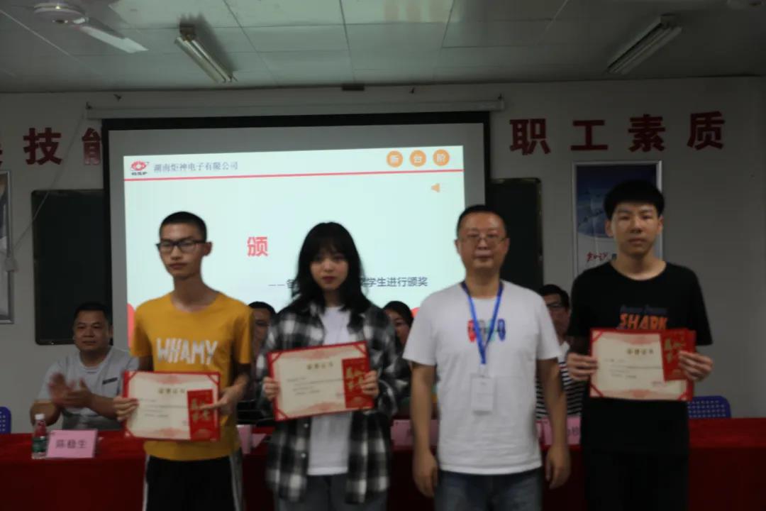 郴州技師學院實習帶隊老師陳穩生、廖宇、周宇,企業代表人事部唐俊峰、肖功桂及100余名實習生參與了本次表彰。